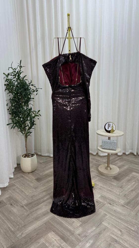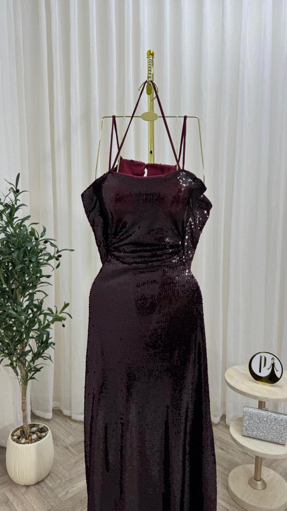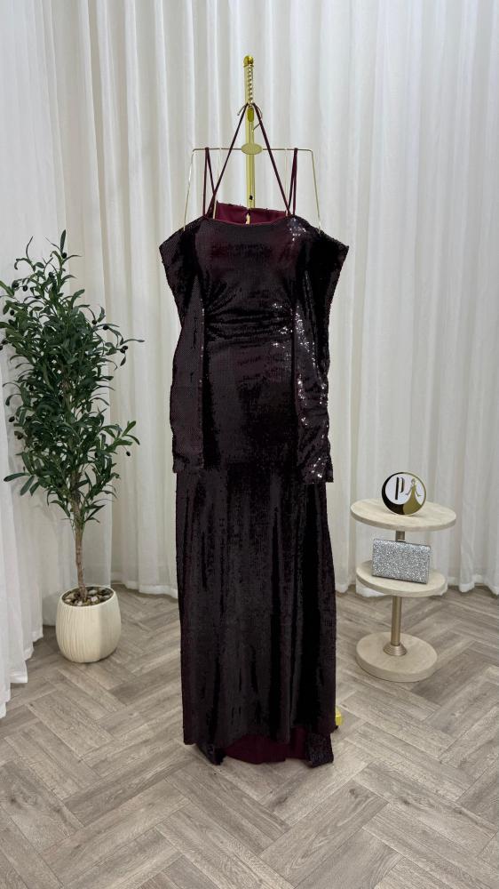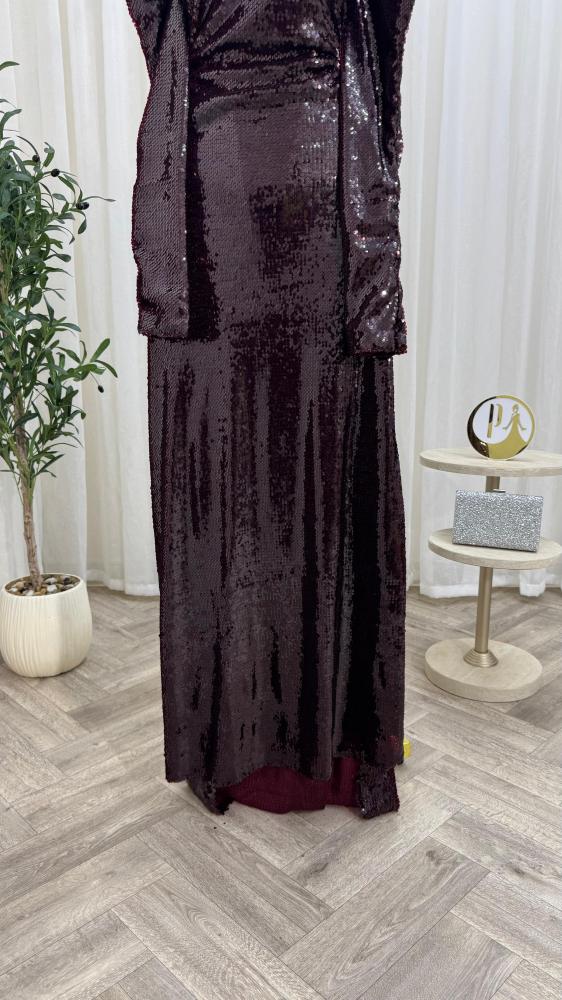 فساتين ترتر بنفسجي من نال استايل يجمع بين سحر اللون البرغندي وفخامة الترتر اللامع في تصميم مكون من قطعتين متناغمتين، حيث يمنحكِ هذا الفستان حضوراً مشرقاً وقصة خلفية ساحرة تجعل من إطلالتكِ لوحة فنية تعبر عن الأناقة العصرية والترف في أرقى السهرات.